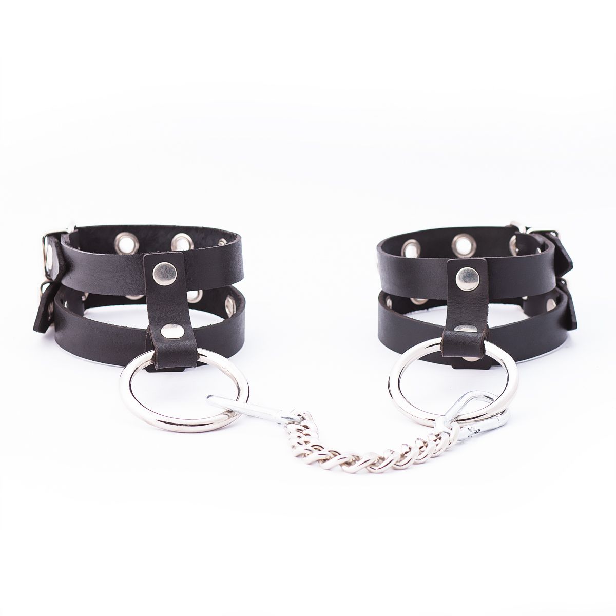 Оковы представляют собой два ремешка из натуральной кожи, соединенных посередине. Минималистичный дизайн позволяет использовать их не только для фиксации рук в любовных играх, но и в качестве аксессуара для дополнения образа. В комплекте стальное кольцо и соединительный элемент в виде прочной цепочки с двумя карабинами. Общая длина - 28 см. Ширина - 5,5 см. Обхват - 18-27 см.