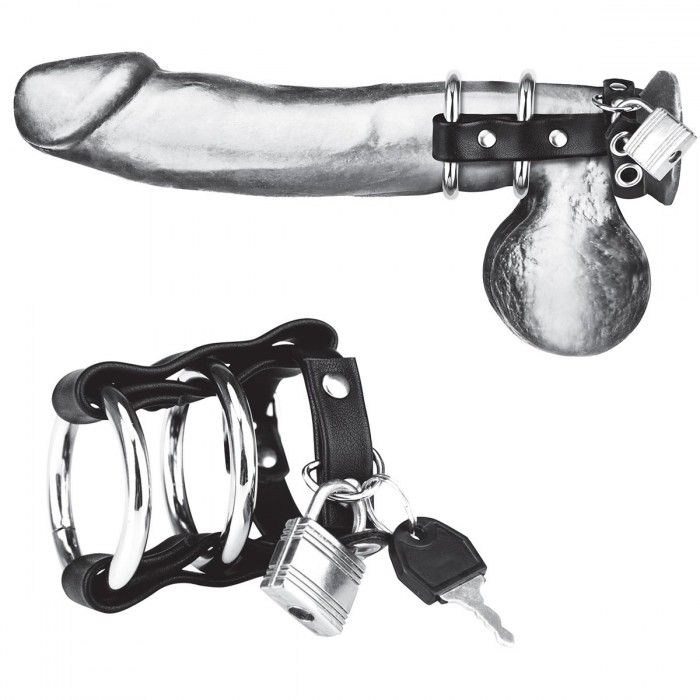 Заблокируй и сдави! Этот запираемый кожаный и металлический замок для члена предназначен для удержания эрекции, сжимает пенис и мошонку, удерживая член металлическим кольцом.