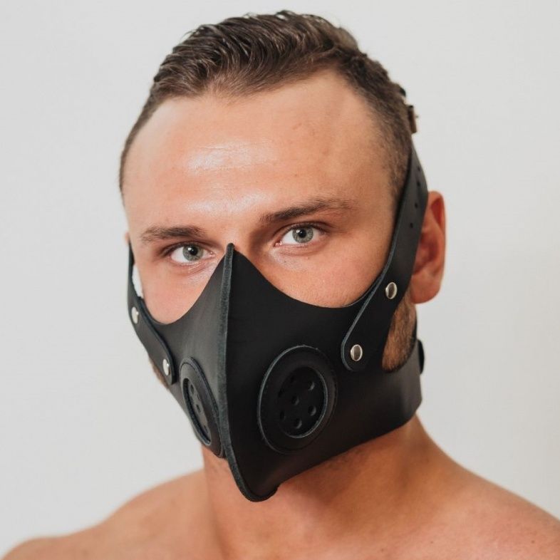 Маска из натуральной кожи черного цвета со вставками по бокам, имитирующими фильтры противогаза, придающие образу соответствующий антураж. Маска надежно фиксируется на голове, отлично подходит для продолжительных ролевых игр.