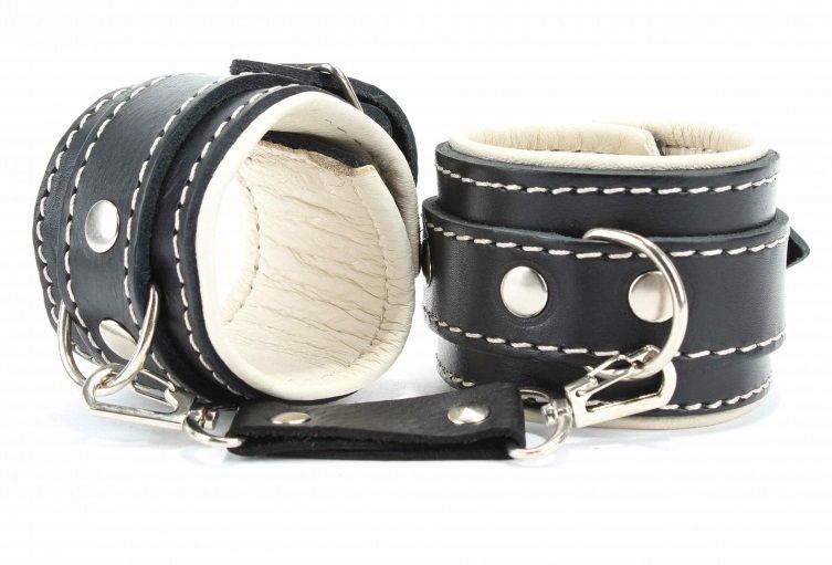 Оковы на руки с бежевым подкладом. Выполнены из толстой ременной кожи черного цвета, подклад мягкая перчаточная кожа светло бежевого цвета. На пряжке. Использована усиленная металлическая фурнитура. Строчка толстой ниткой контрастного светлого цвета.
